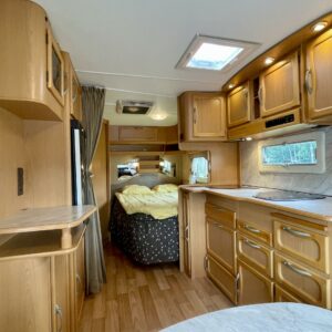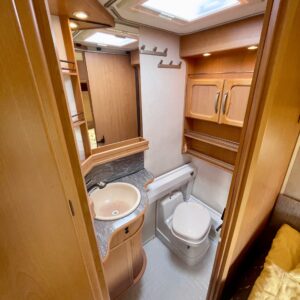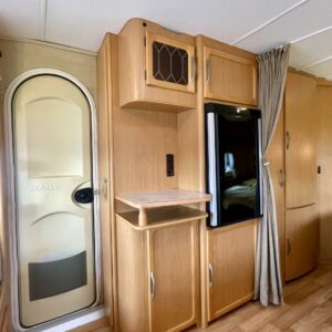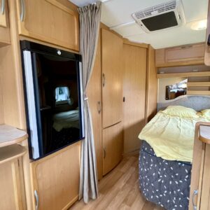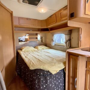 Alde, Insulated grey water tank, Fridge, Cassette WC, Cassette blinds, Roof hatch, Stove, Hot water boiler, Fluid circulation heating, Freezer compartment, Sink, Double bed, Bicycle rack, Radio, Shower, Electric heating cartridge, Support legs, Lattialämmitys (nestekierto), Ilmastointi (asuintila), kwh-mittari, Kesärenkaat, kaasun ulosotto, sähkön ulosotto