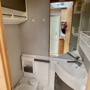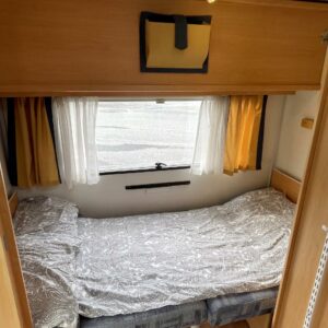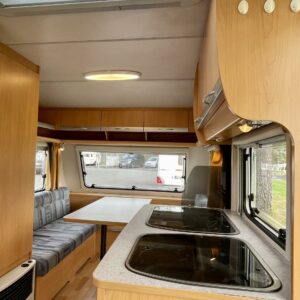 Fridge, Cassette WC, Roof hatch, Stove, Hot water boiler, Double bed, Sink, TV-antenni tai lautasantenni, Trumatic, Support legs, Cassette blinds