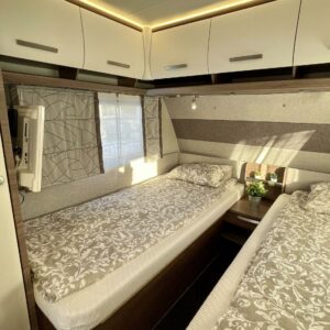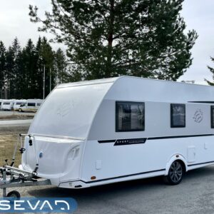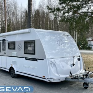 Bicycle rack, Sun shade, Invertteri, Separate beds, Solar panel, Special wheels, Fridge, Cassette WC, Cassette blinds, Roof hatch, Passenger area carpets, Stove, Hot water boiler, Freezer compartment, Sink, Shower, Electric heating cartridge, Trumatic, Support legs, Kesärenkaat, kwh-mittari, sähkön ulosotto, televisioteline