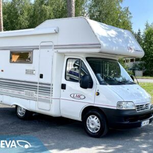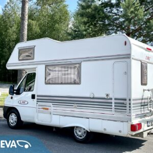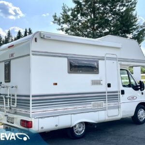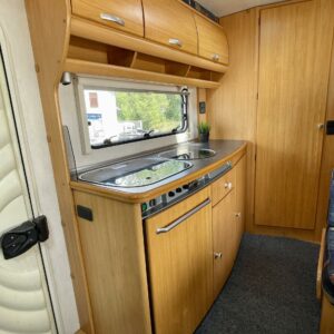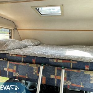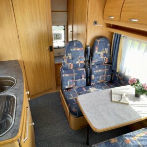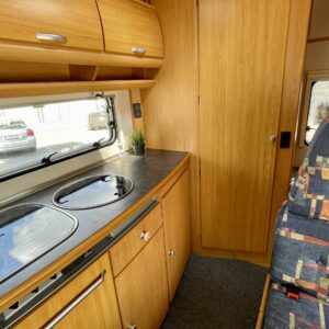 Fridge, Cassette WC, Cassette blinds, Roof hatch, Hot water boiler, Stove, Sun shade, Power steering, Freezer compartment, Double bed, Sink, Bicycle rack, Trumatic, Turbo, Towing hook
