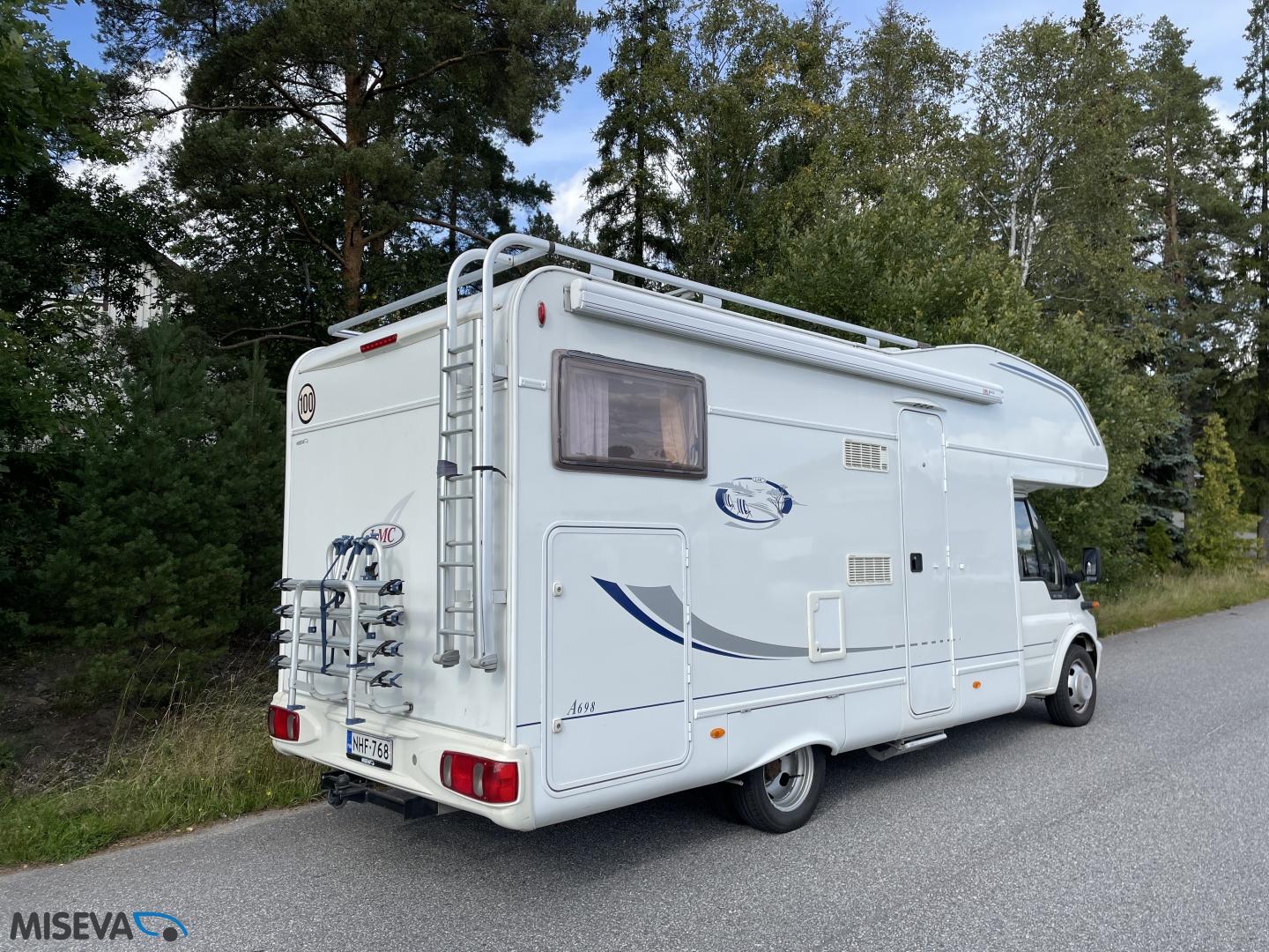 ABS brakes, Airbag, Fridge, Two tyre sets, Cassette WC, Kattokaiteet/tikaat, Roof hatch, Central heating, Stove, Hot water boiler, Sun shade, Power steering, Freezer compartment, Double bed, Sink, Bicycle rack, Electric windows, Power side mirrors, Trumatic, Towing hook, CD-Radio