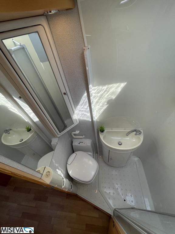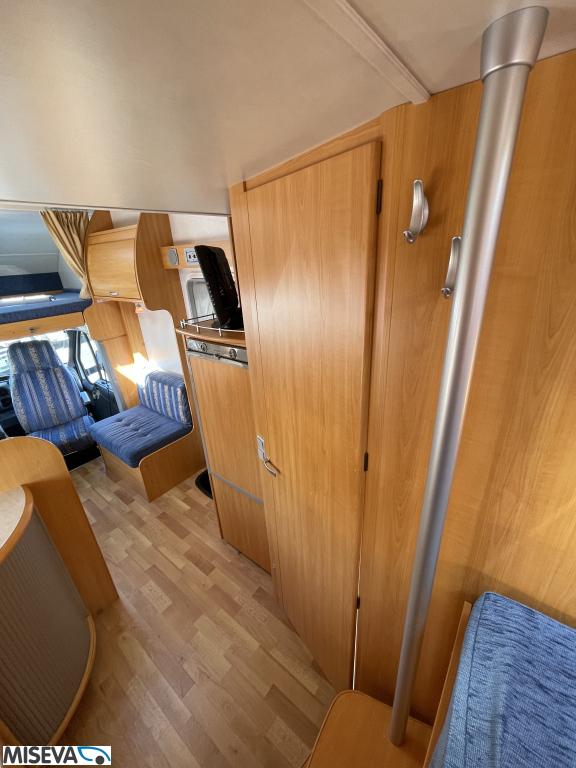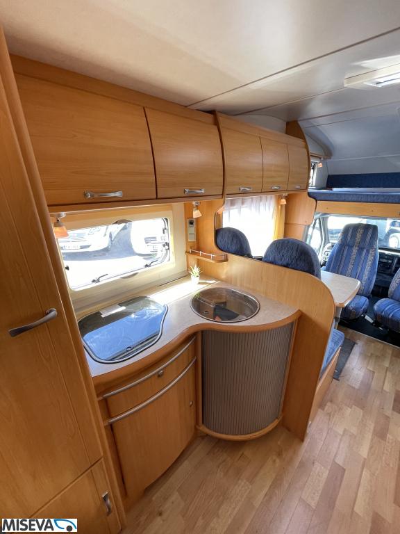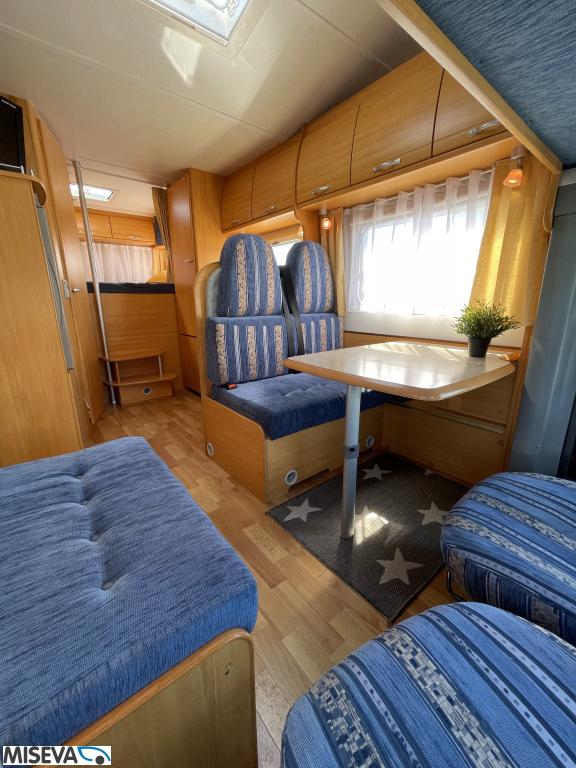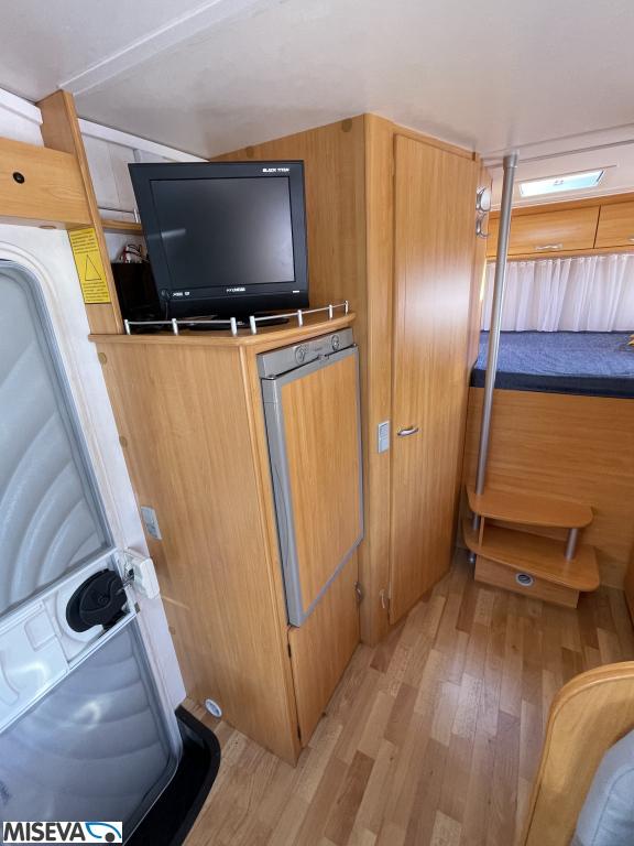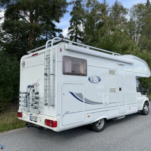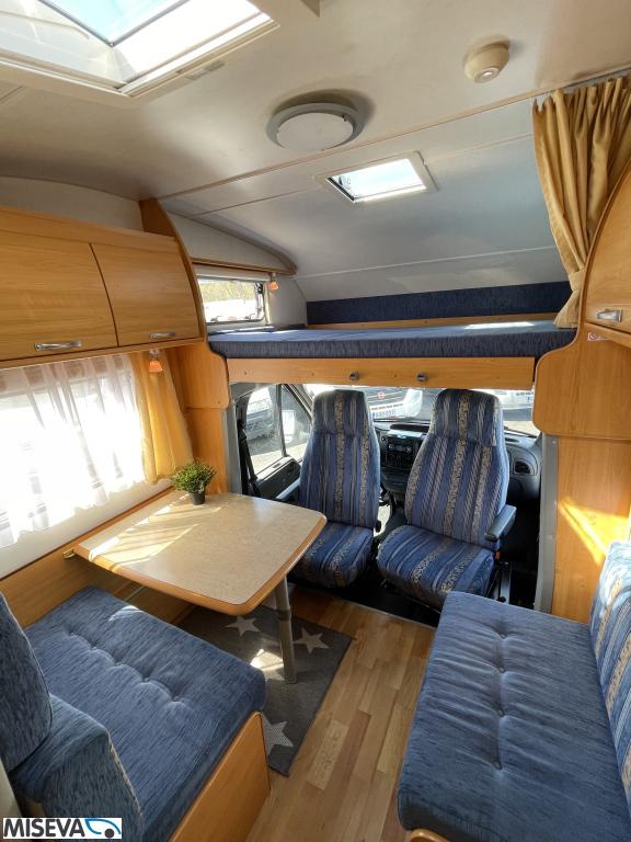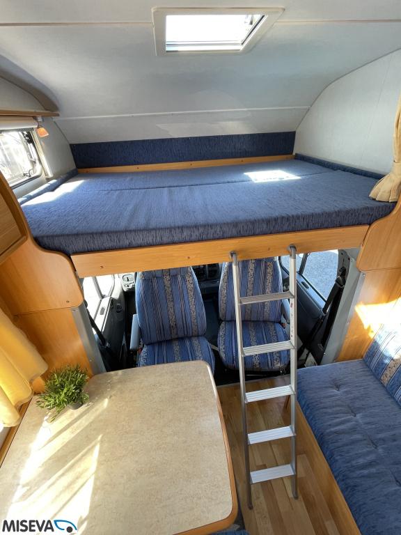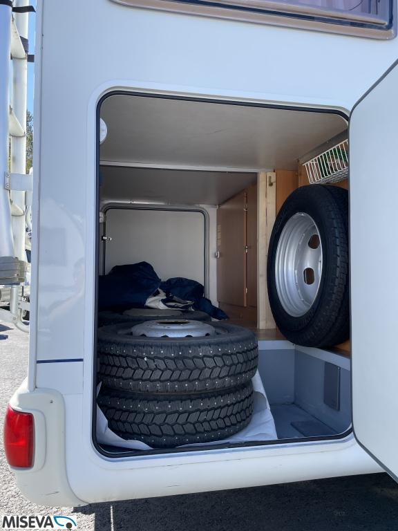 ABS brakes, Airbag, Fridge, Two tyre sets, Cassette WC, Kattokaiteet/tikaat, Roof hatch, Central heating, Stove, Hot water boiler, Sun shade, Power steering, Freezer compartment, Double bed, Sink, Bicycle rack, Electric windows, Power side mirrors, Trumatic, Towing hook, CD-Radio