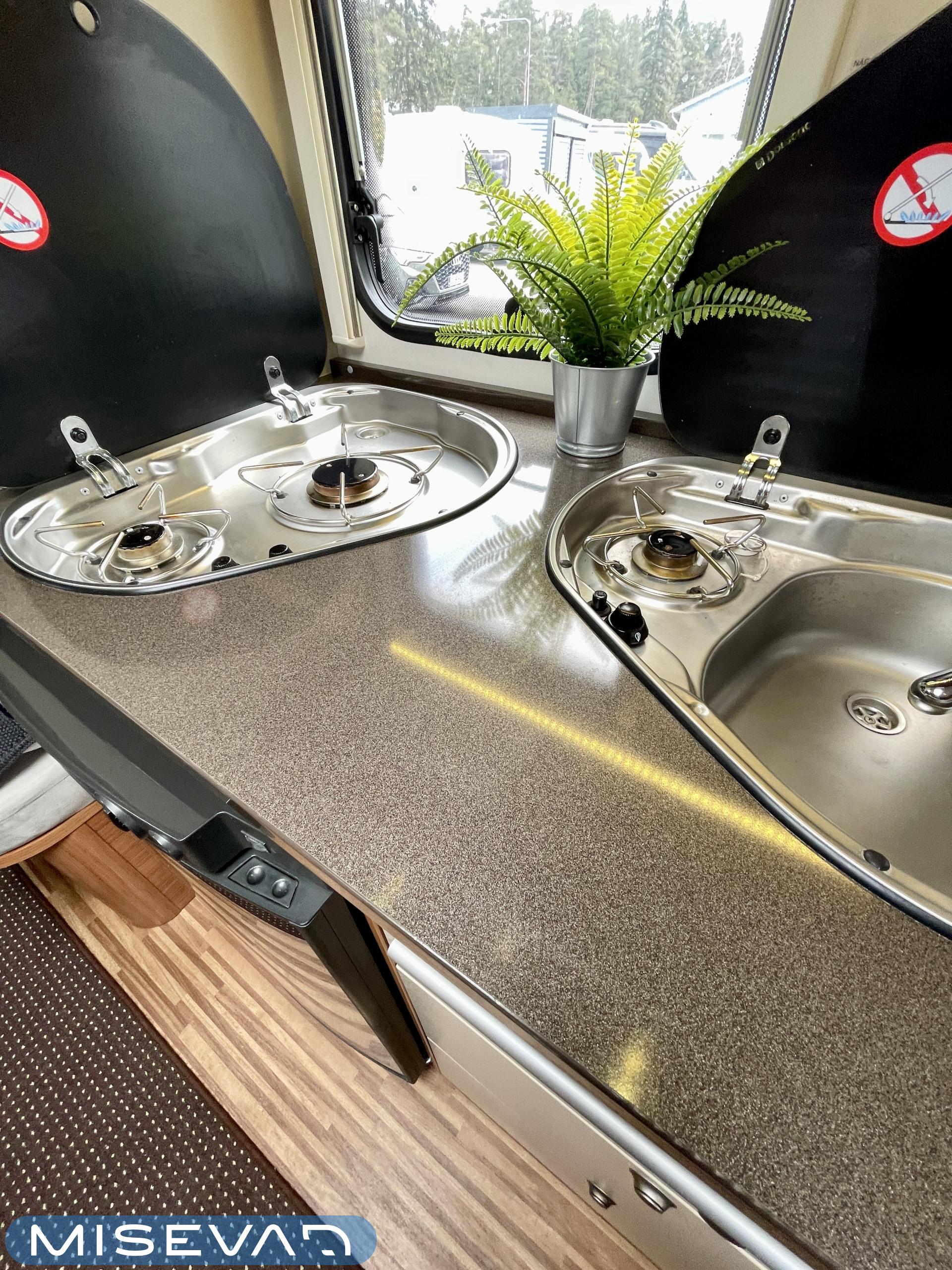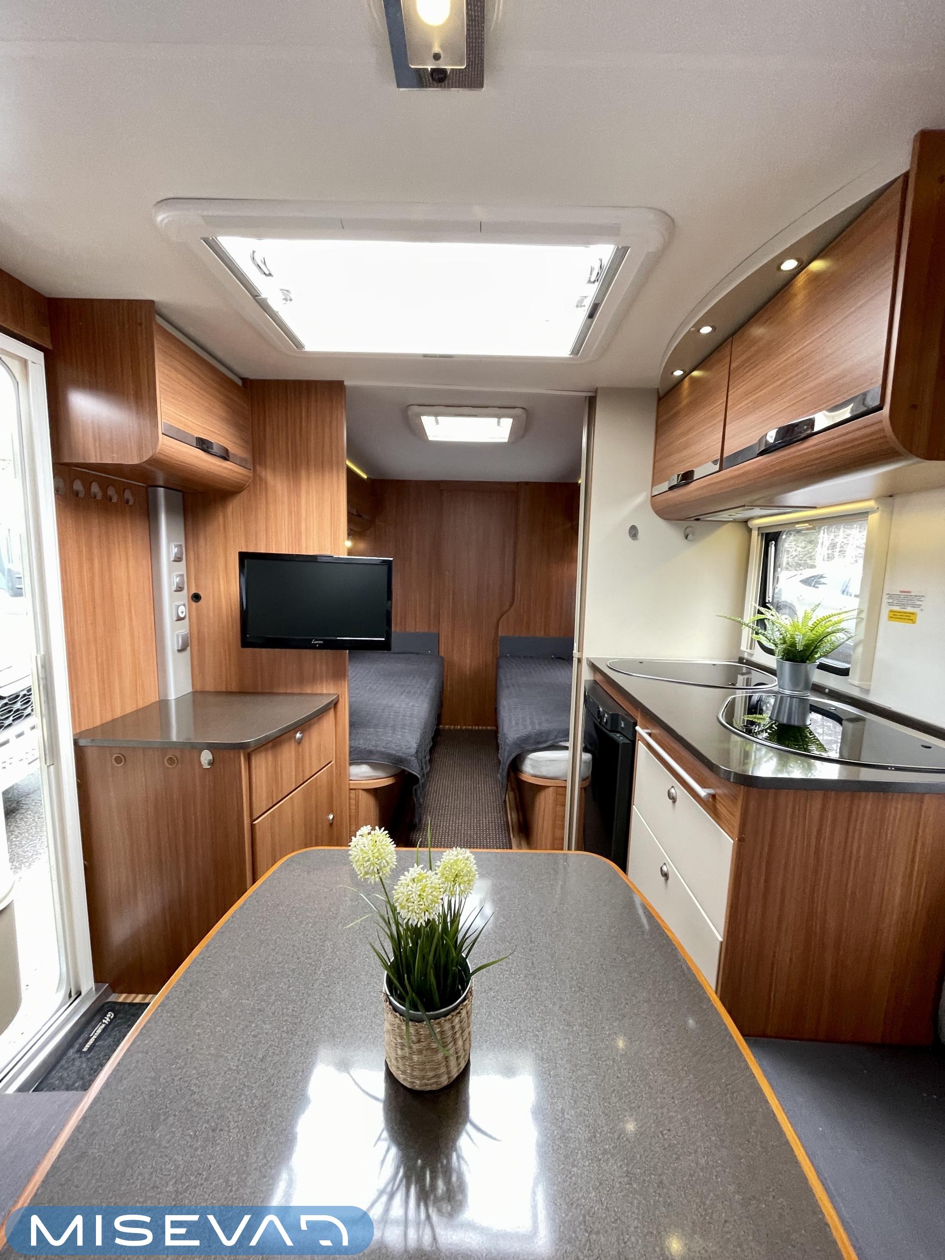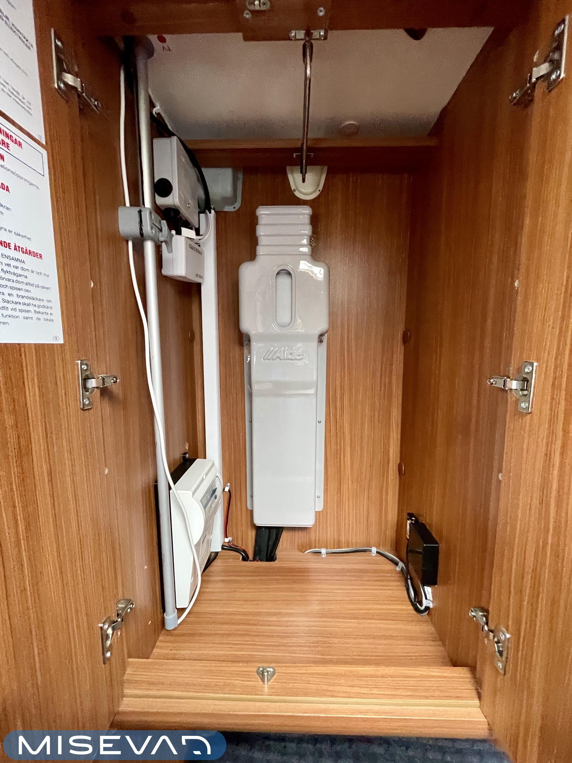 Solar panel, Separate beds, Fridge, Cassette WC, Cassette blinds, Roof hatch, Passenger area carpets, Stove, Hot water boiler, Mover, Fluid circulation heating, Freezer compartment, Sink, TV-antenni tai lautasantenni, Support legs, Alde, Lattialämmitys (nestekierto), Kesärenkaat, Tupla-akut, kwh-mittari, Insulated grey water tank, liesituuletin, pullonvaihtaja, kaasun ulosotto, sähkön ulosotto, televisioteline, Asuinosan hyttysovi/verho