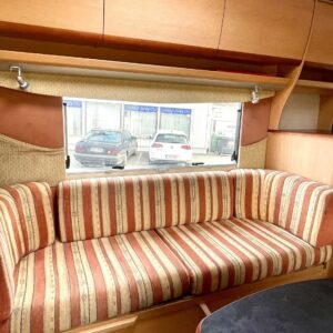 Fridge, Two tyre sets, Cassette WC, Cassette blinds, Roof hatch, Central heating, Stove, Engine heater, Hot water boiler, Sun shade, Freezer compartment, Double bed, Sink, Bicycle rack, Stereo system, Shower, Electric windows, Power side mirrors, Electric steps, Rear kitchen, Trumatic, Double bottom, Turbo, Service history, Keskuslukitus: Ilman kaukosäädintä, Radio