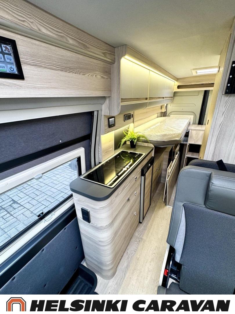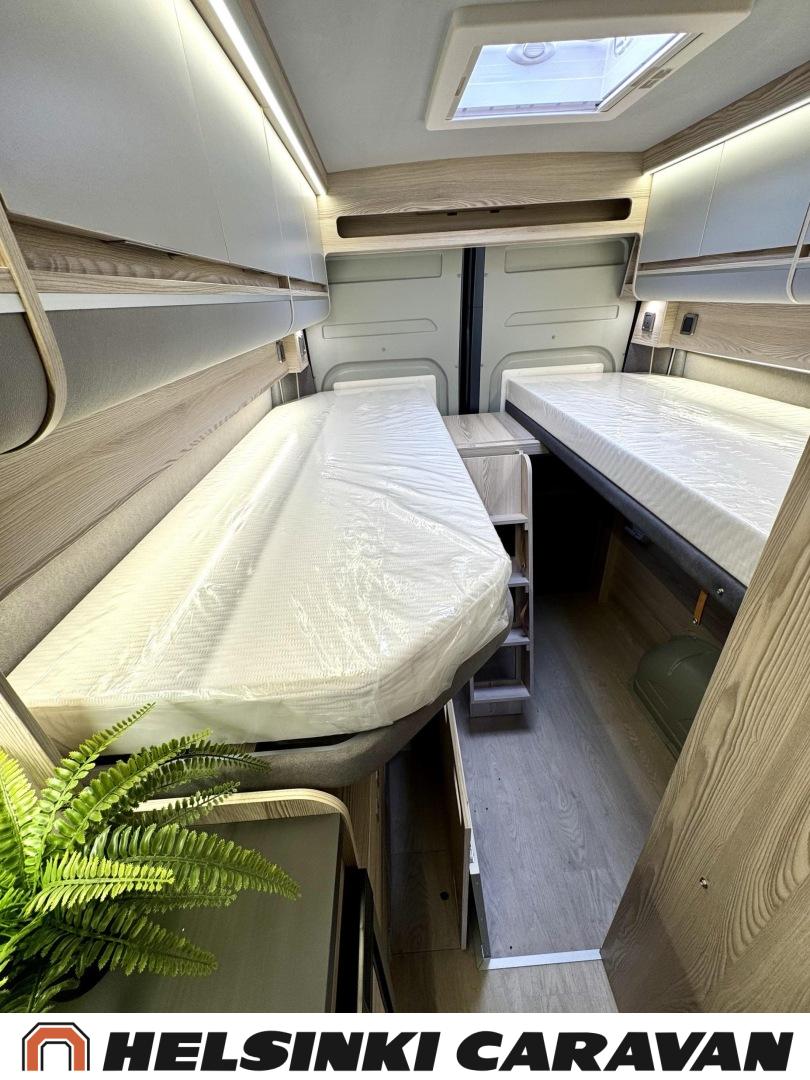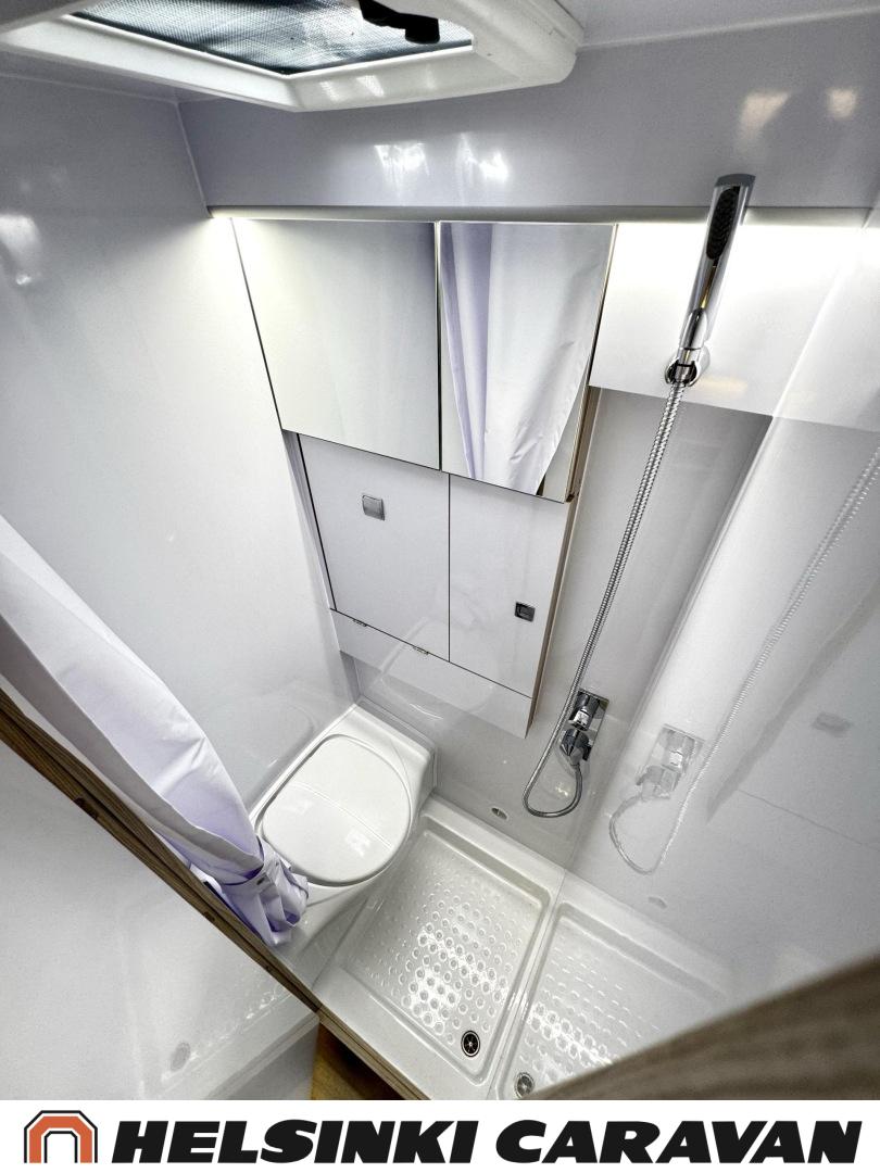 Specialfälgar, Separata sängar, Isolerad gråvattentank, Luftkonditionering i körutrymmet, Taklucka, Keskuslukitus: Kaukosäätöinen, Centralvärme, Trumatic, Golvmattor i boendedelen, Spis, Varmvattenberedare, Markis, Navigator, Frysfack, Servostyrning, Parsäng, Dusch, Elektriska fönster, Elektriska speglar, Elektrisk trappa, Elpatron, Kassettgardiner, Pysäköintikamera, Bränsledriven extravärmare, Radio