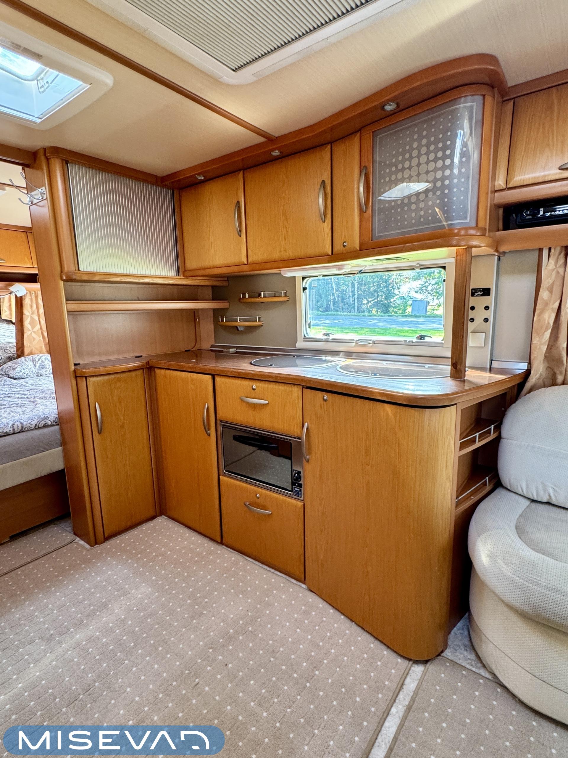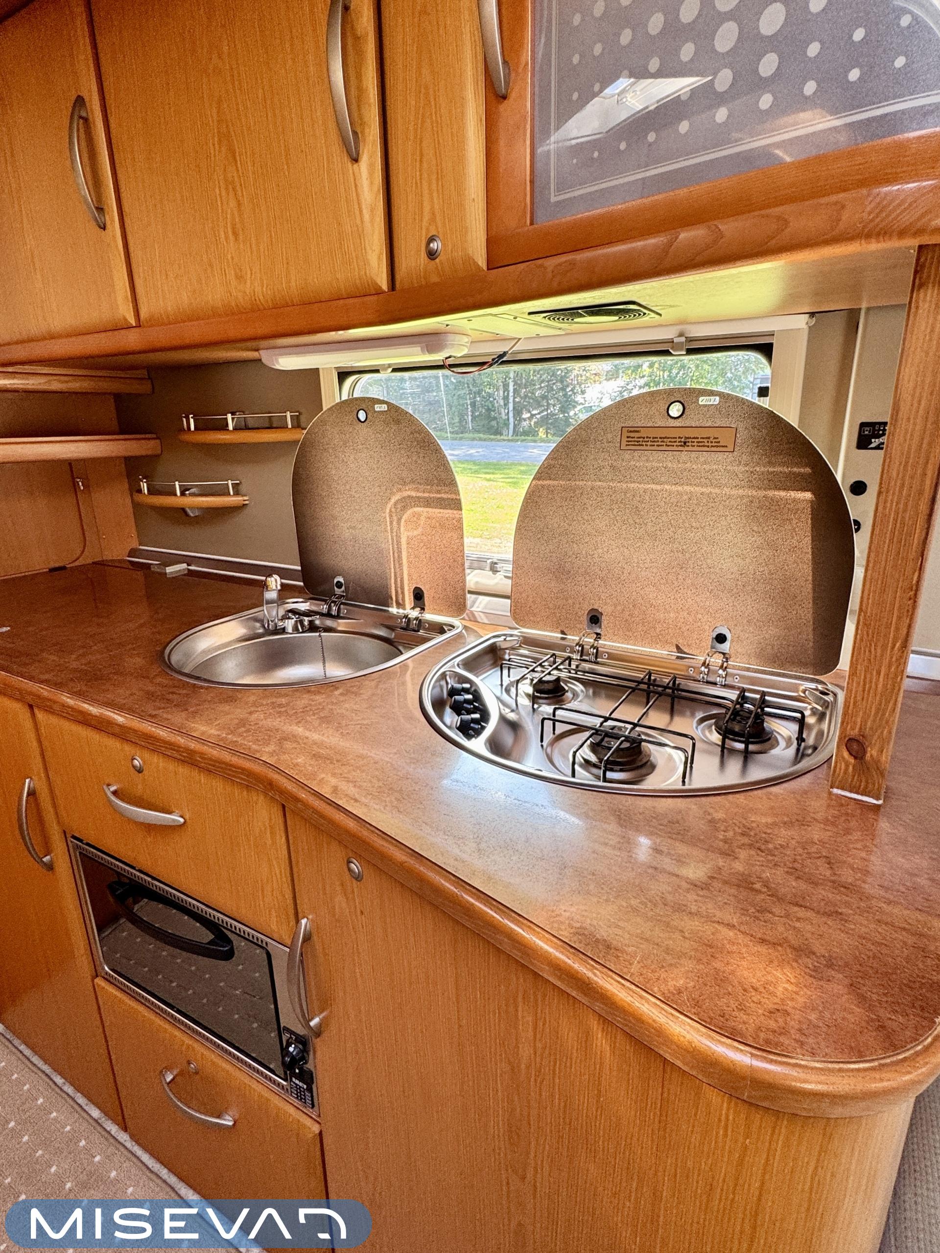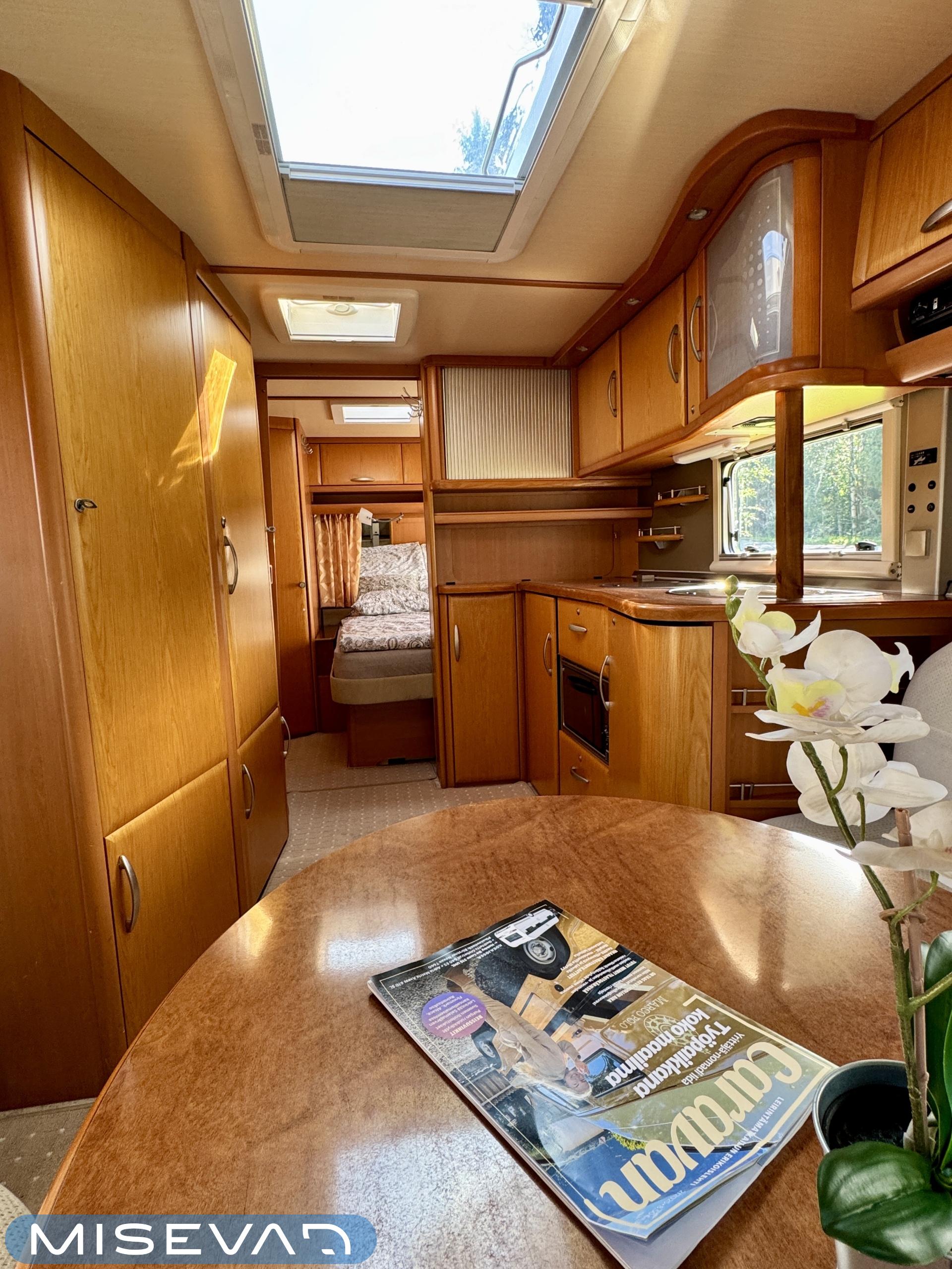 Alde, Elpatron, Kassettgardiner, Dusch, Taklucka, Kylskåp, Gasugn, Två däck, Kassettoalett, Spis, Markis, Radio, liesituuletin, Vätsecirkulationsvärme, Parsäng, Frysfack