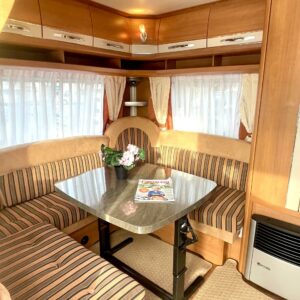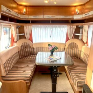 Separata sängar, Kylskåp, Kassettoalett, Varmvattenberedare, Taklucka, Markis, Tvättho, Radio, Trumatic, Stödben