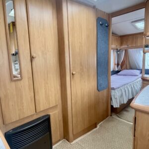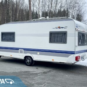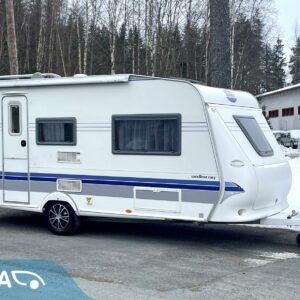 Separata sängar, Kylskåp, Kassettoalett, Kassettgardiner, Takstänger/stege, Taklucka, Golvmattor i boendedelen, Spis, Varmvattenberedare, Markis, Frysfack, Tvättho, Elpatron, Trumatic, Stödben, kwh-mittari, sähkön ulosotto