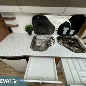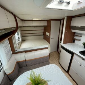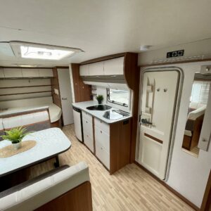 Solpanel, Kylskåp, Kassettoalett, Kassettgardiner, Taklucka, Våningssäng, Golvvärme, Golvmattor i boendedelen, Spis, Varmvattenberedare, Markis, Frysfack, Parsäng, Tvättho, Elpatron, Trumatic, Stödben, Lattialämmitys (sähkö)