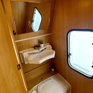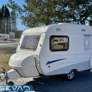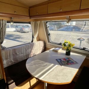 Lattialämmitys (sähkö), Kylskåp, Kassettoalett, Kassettgardiner, Taklucka, Spis, Frysfack, Parsäng, Tvättho, Bakre kök, Stödben